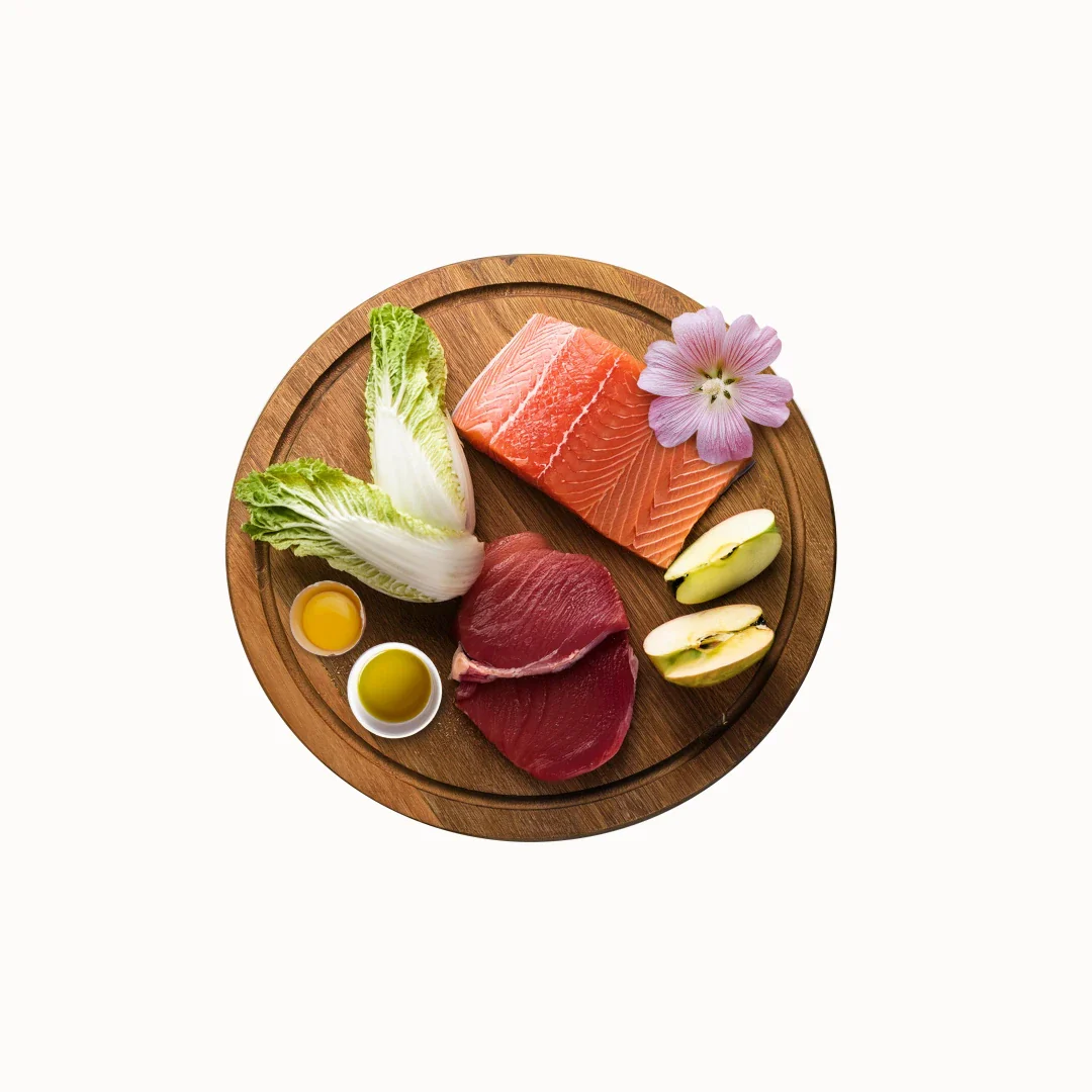 Αφυδατωμένο κρέας 38% (μοσχάρι μίν. 40%, κοτόπουλο μίνιμουμ 30%, αρνί μίνιμουμ 10%), ρύζι (μίνιμουμ 20%), αφυδατωμένος σολομός 7%, αραβόσιτος, παράγωγα σιταριού, ζωικό λίπος, φακές (2%), πολτός τεύτλων, μαγιά μπύρας, αφυδατωμένα καρότα, εκχύλισμα γιούκα, λάδι σολομού, εκχύλισμα κιχωρίου (1%), αφυδατωμένα αυγά (0,5%), αφυδατωμένα μήλα (0,2%), ελαιόλαδο (0,13%), αφυδατωμένη ντομάτα (0,12%), Althea officinalis (0,041%), Cynara scolimus hayek (0,037%), Rosmarinus officinalis (0,035%), Origanum vulgare (0,033%), Salvia officinalis (0,031%), σκόνη σκόρδου (0,03%), Equisetum arvense (0,028%).