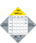 Κουτάβι 1-3 μηνών: Κουτάβι 3-5 μηνών: Βάρος ενήλικου σκύλου 2 kg = 50 g τροφής Βάρος ενήλικου σκύλου 2 kg = 60 g τροφής Βάρος ενήλικου σκύλου 4 kg = 80 g τροφής Βάρος ενήλικου σκύλου 4 kg = 100 g τροφής Βάρος ενήλικου σκύλου 6 kg = 100 g τροφής Βάρος ενήλικου σκύλου 6 kg = 120 g τροφής Βάρος ενήλικου σκύλου 8 kg = 120 g τροφής Βάρος ενήλικου σκύλου 8 kg = 140 g τροφής Βάρος ενήλικου σκύλου 10 kg = 150 g τροφής Βάρος ενήλικου σκύλου 10 kg = 185 g τροφής Κουτάβι 5-8 μηνών: Κουτάβι 8-10 μηνών: Βάρος ενήλικου σκύλου 2 kg = 50 g τροφής Βάρος του ενήλικου σκύλου 2 kg = Ενήλικο Mini Βάρος ενήλικου σκύλου 4 kg = 90 g τροφής Βάρος του ενήλικου σκύλου 4 kg = Ενήλικο Mini Βάρος ο ενήλικος σκύλος 6 kg = 110 g τροφής Βάρος του ενήλικου σκύλου 6 kg = 110 g τροφής Βάρος του ενήλικου σκύλου 8 kg = 130 g τροφής Βάρος του ενήλικου σκύλου 8 kg = 130 g τροφής Βάρος του ενήλικου σκύλου 10 kg = 190 g τροφής Βάρος του ενήλικου σκύλου 10 kg = 175 g τροφής