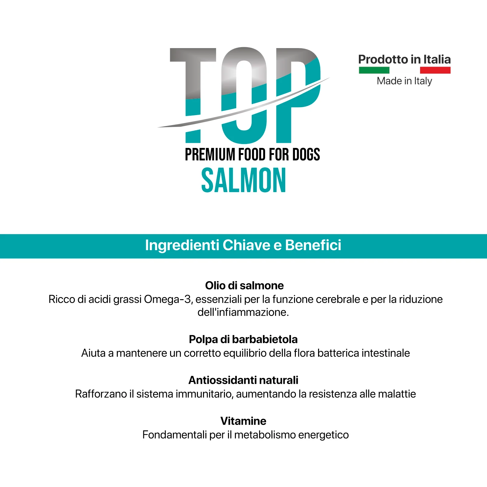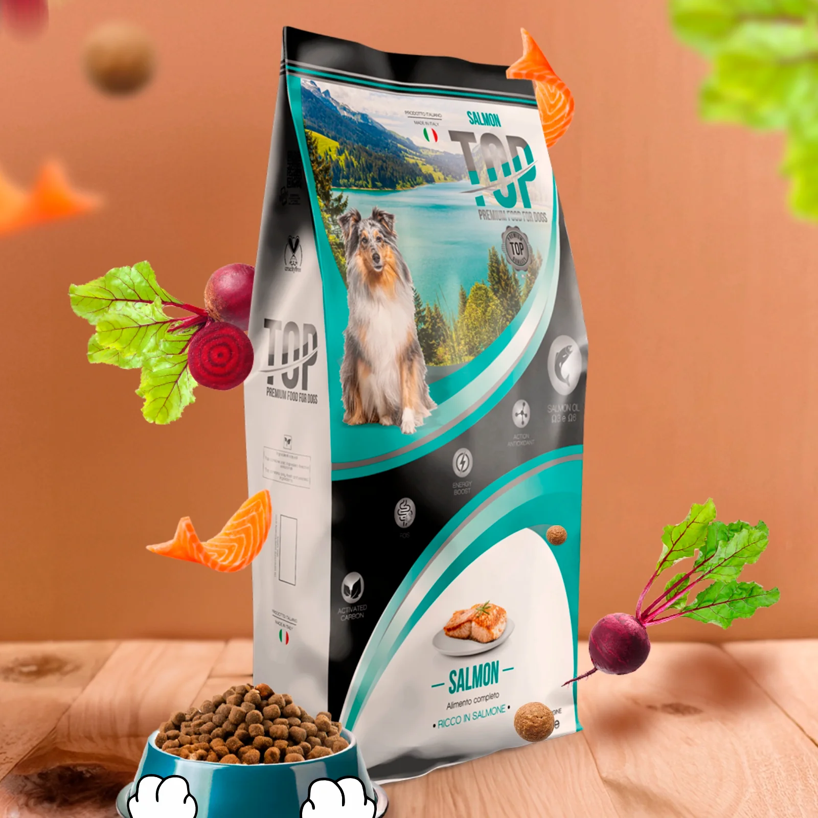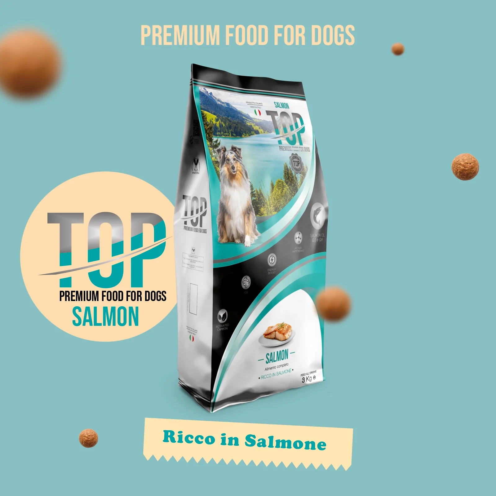 Το TOP Salmon φέρνει ποιότητα στο μπολ του σκύλου σας. Η TOP Salmon είναι μια πλήρης, ισορροπημένη, γνήσια τροφή για σκύλους με υψηλή θρεπτική αξία που προσφέρει τη βέλτιστη παροχή πρωτεϊνών, λιπών, υδατανθράκων, βιταμινών και μετάλλων χρήσιμων για τη διατροφή και την ευημερία του ενήλικου σκύλου σας.