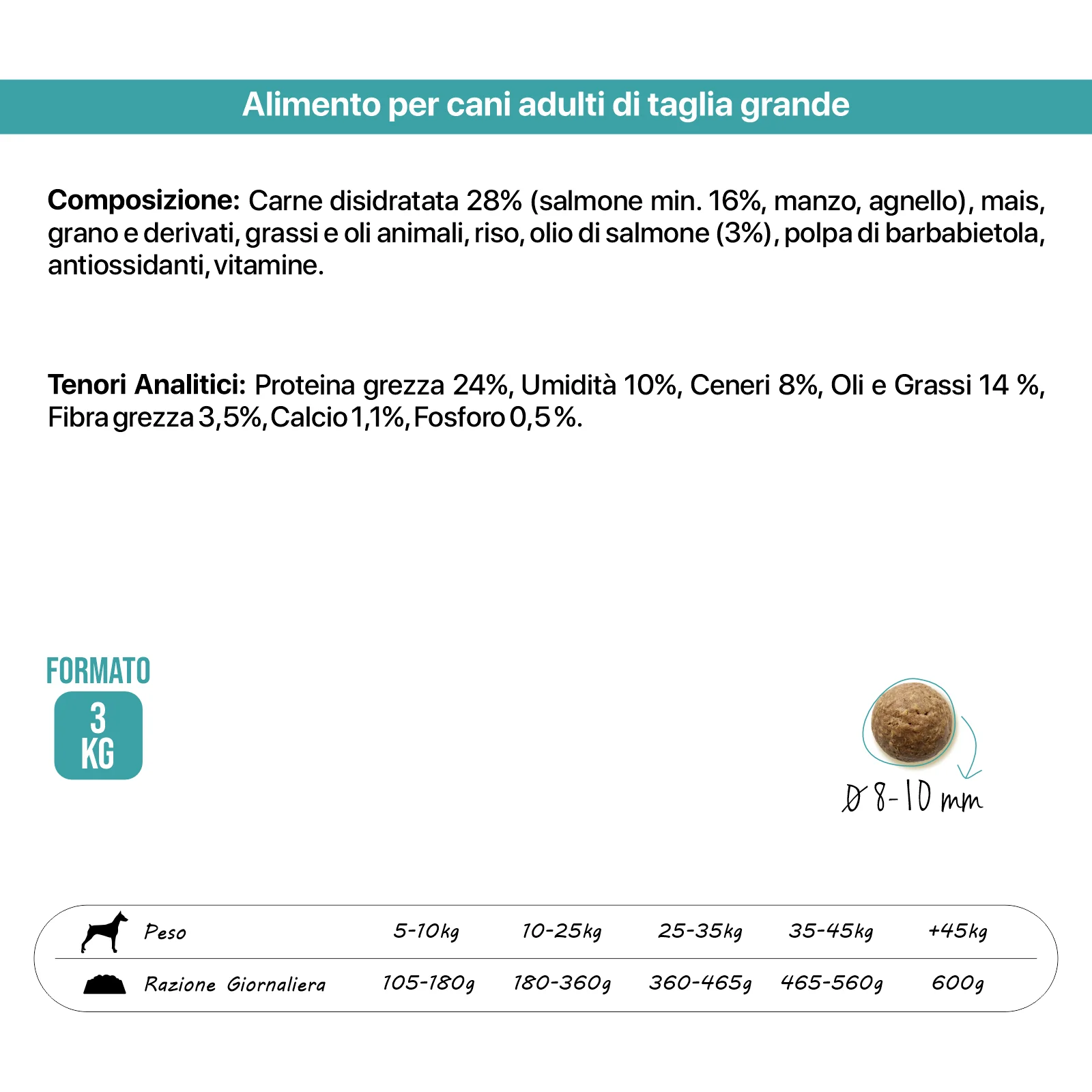 Αφυδατωμένο κρέας 28% (σολομός μίν. 16%, μοσχάρι, αρνί), καλαμπόκι, σιτάρι και παράγωγα, ζωικά λίπη και έλαια, ρύζι, λάδι σολομού (3%), πολτός τεύτλων, αντιοξειδωτικά, βιταμίνες.